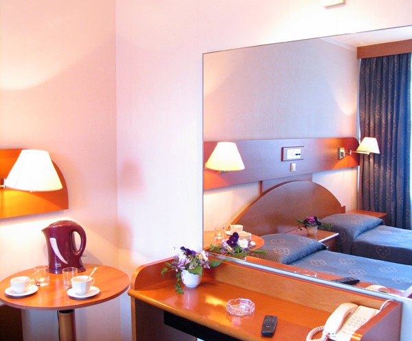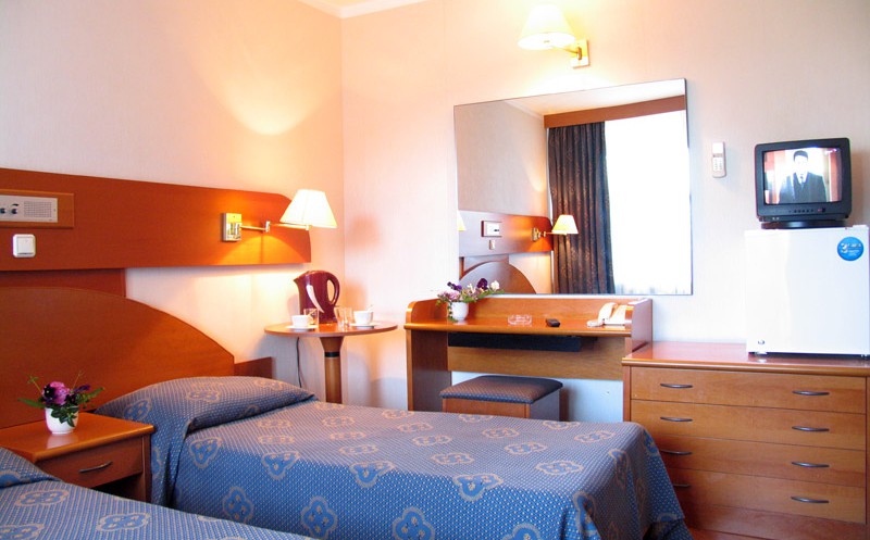 Комната: две 1,5-спальные кровати, тумбочки, бра, коврики, туалетный столик, два встроенных платяных шкафа, ТВ, кондиционер, радио, выход на балкон (летняя мебель).