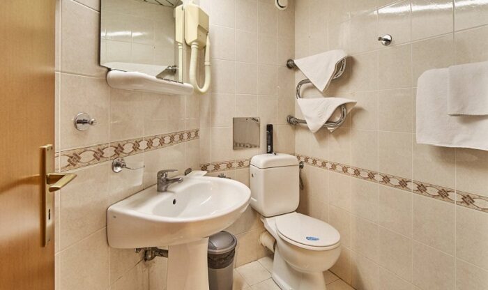 Санузел: ванная 1,7 м или душевая кабина, умывальник, унитаз, фен, полотенце.