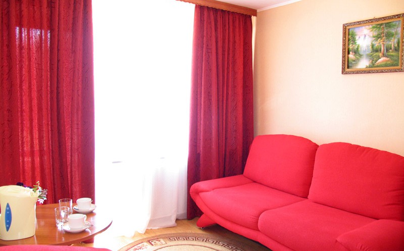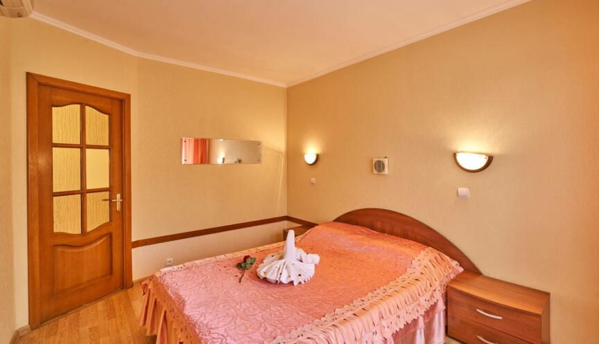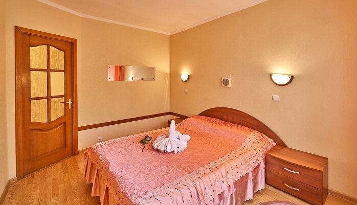 Гостиная: диван (еврокнижка), кресло, TV на тумбе, кондиционер, внутренний телефон, круглый стол, бра, выход на балкон, прихожая. Спальня: 2-спальная кровать, тумбочки, бра, коврики, туалетный столик, два встроенных платяных шкафа, кондиционер, радио, выход на балкон. Санузел: душевая кабина или ванна, умывальник, унитаз, фен, полотенце сушитель.