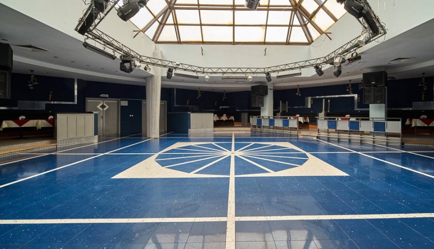 Диско-зал выполнен в форме круга рассчитан на 50–70 посадочных мест, состоит из двух уровней и выполнен в виде невысокого парапета, где по кругу стоят удобные диваны с размещение в них по 4-6 человек. Над каждым диваном имеются дополнительные светильники.
