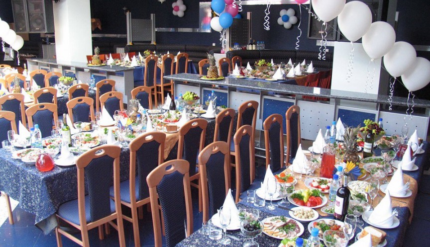 По желанию клиента возможно размещение гостей на танцполе. Интерьер зала выдержан в серебристо-синих тонах. Плитка танцпола цвета индиго с серебристыми вкраплениями сверкает в вечернее время и создает впечатление легкого присутствия небесных оттенков. Обилие современного светового оборудования позволяет моделировать световые потоки нужных рисунков, оттенков, создавая неповторимую атмосферу праздничного настроения.